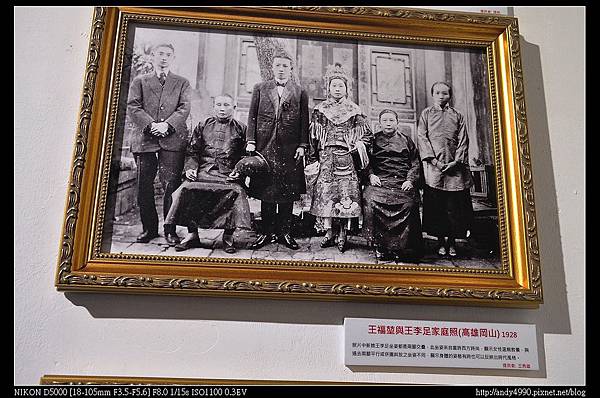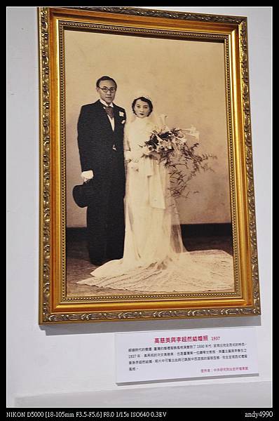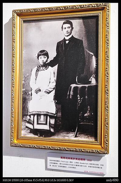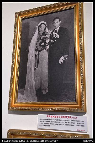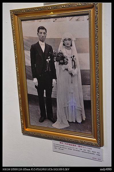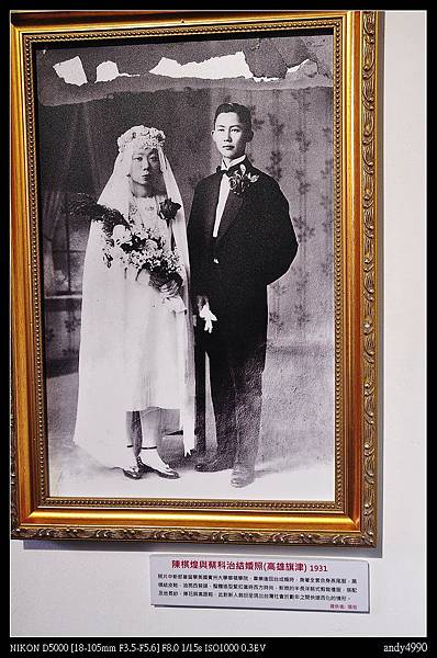1931新人照中的新郎為美國賓州大學華頓學院的高材生,身著燕尾服、黑皮鞋與油亮的西裝頭,新娘的半長洋裝禮服搭配及地長紗、高跟鞋,顯示台灣快速西化的過程