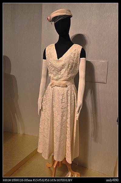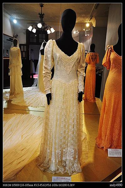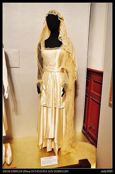 1940的婚紗則為五角領、泡芙袖,禮服由蕾絲與綢緞組成,胸前及頭紗則配有手工蠟花