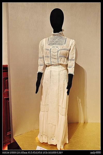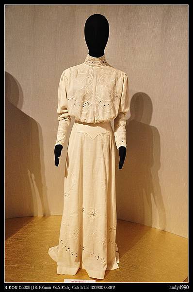 1900英國愛德華七世時期的棉製婚紗,可看出當時是將布料剪洞後縫邊,創作出縷空的效果