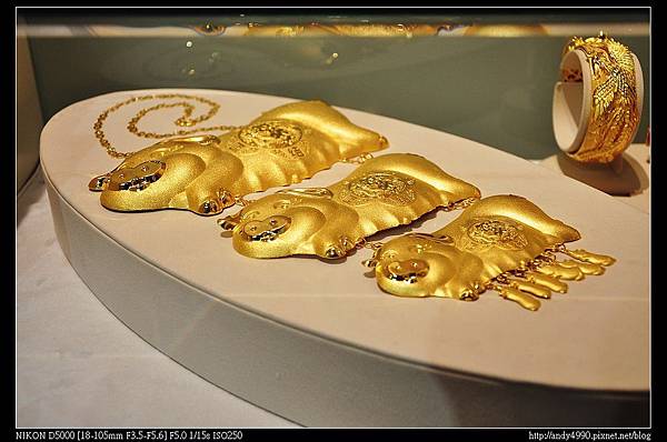 脖子所掛的黃金豬牌台灣較少見,寓意開枝散葉、多子多孫